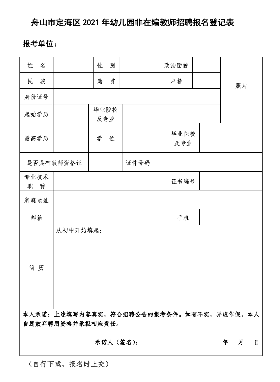 现场报名。报名时需要提供以下材料:近期1寸免冠彩照2张;本人身份证、户口本、教师资格证书、学历证书、工作经历证明(盖公章)、中层干部经历证明(盖公章)等原件和复印件。报名前本人须如实填写好《舟山市定海区2021年幼儿园非在编教师招聘报名登记表》(以下简称《报名表》,见附件)。
