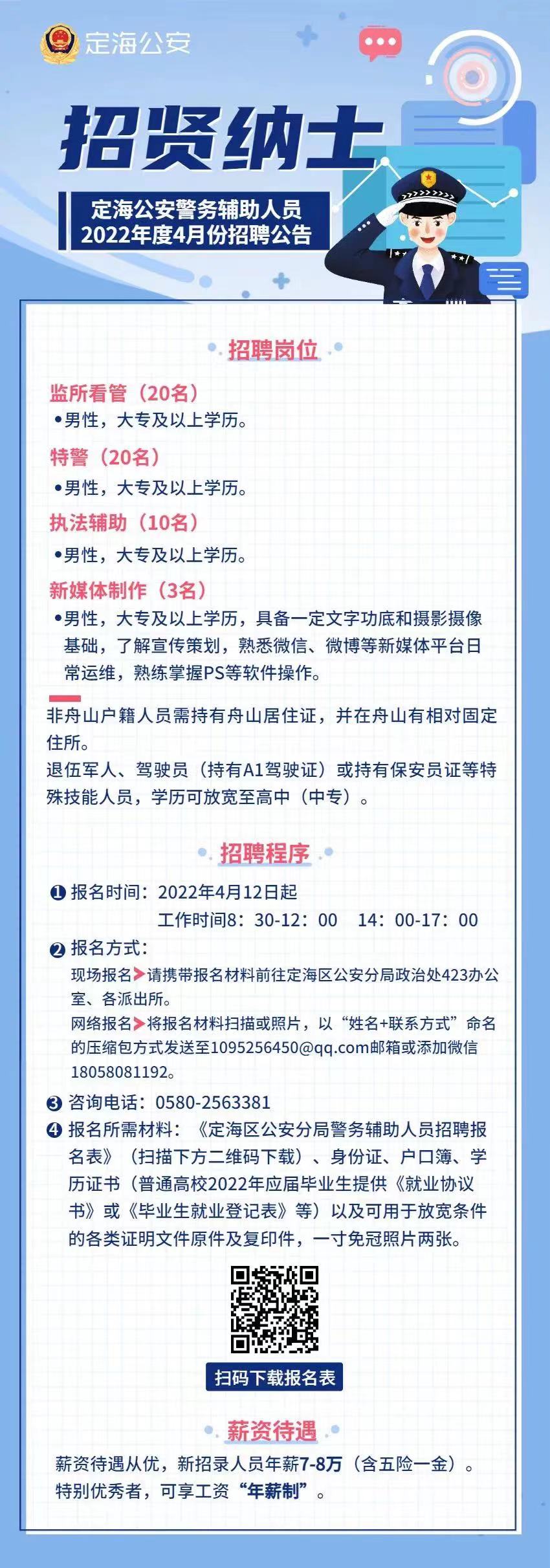 因工作需要,定海区公安分局面向社会公开招聘警务辅助人员,有意者可按以下规定条件和程序报名。